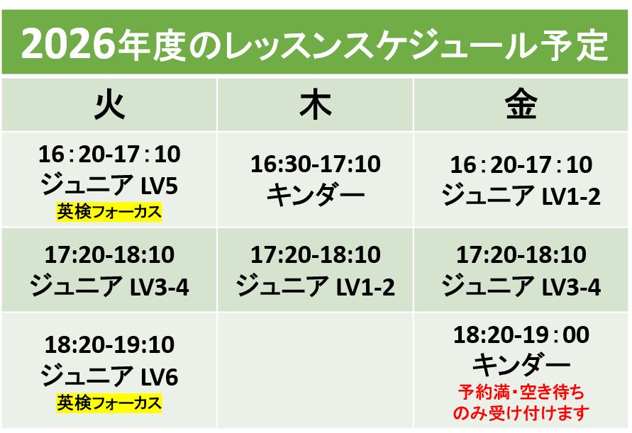 レッスンスケジュールレッスン枠は、その都度調整しております。最新の空き状況はどうぞ教室へお問い合わせください!2026.2.14現在レッスン内容の詳細・その他ご不明な点はお電話・LINEにてお問合せください。